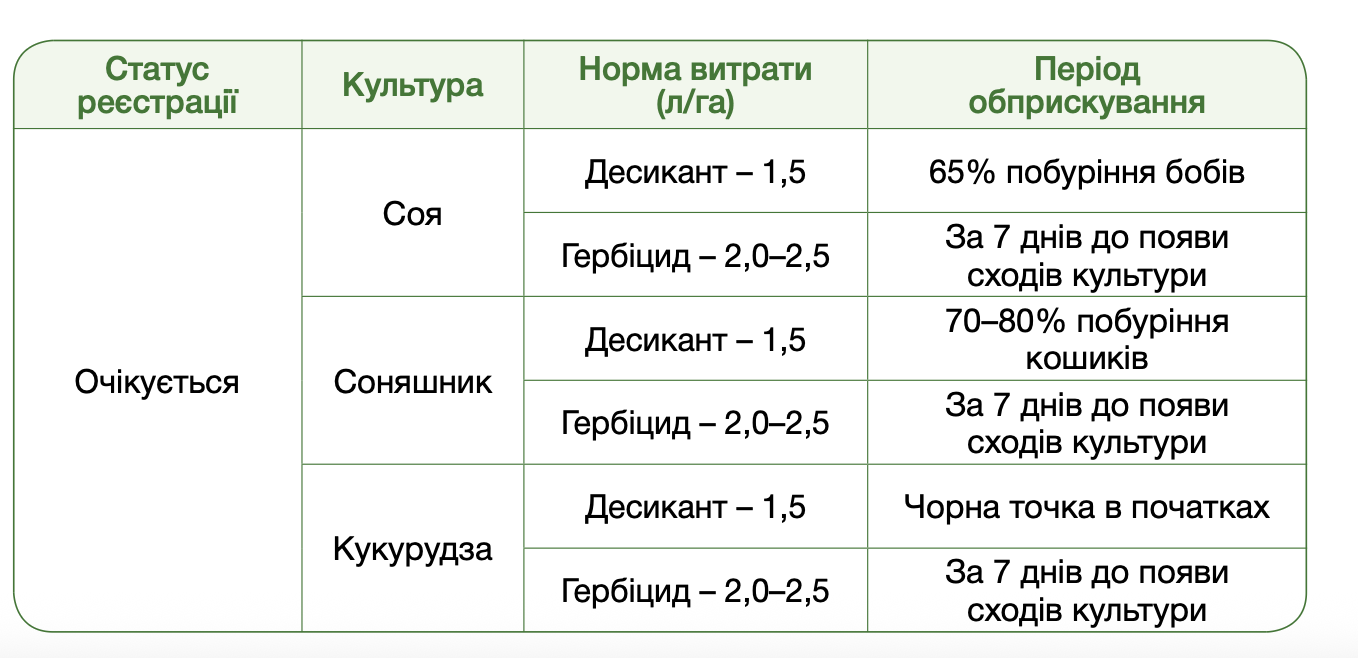 м’яка десикація, яка прискорює надходження поживних речовин у плоди та насіння, що сприяє покращенню якості врожаю (виповненість насіння, підвищення енергії проростання та ін.)