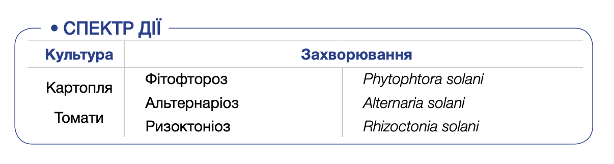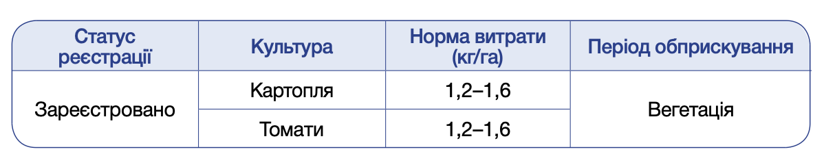 проникає у рослину за 30 хв і захищає протягом 10–14 днів навіть за вологої погоди; добре переноситься рослинами незалежно від стадії розвитку культури