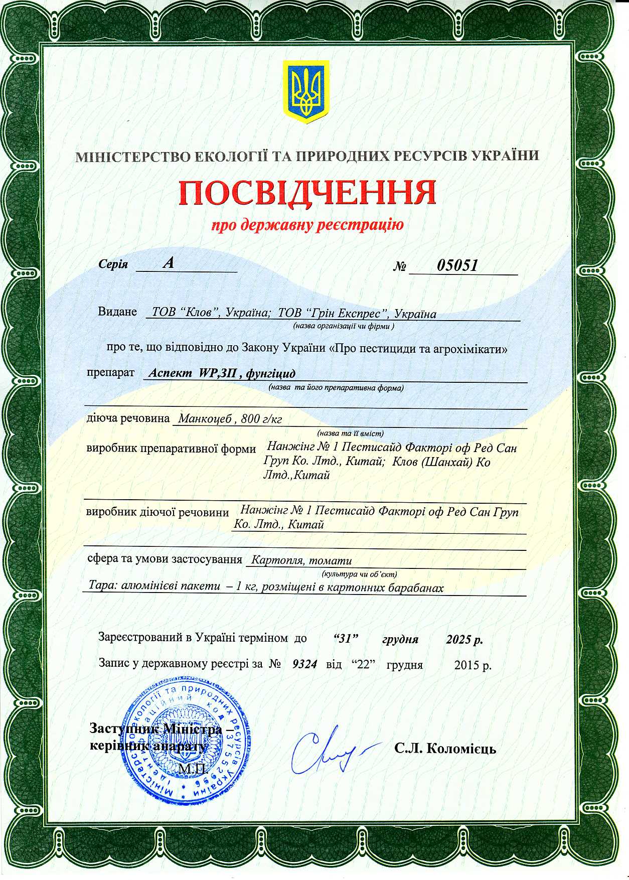 • АСПЕКТ WP, 3П – фунгіцид контактної дії для захисту картоплі й томатів від комплексу грибкових хвороб.