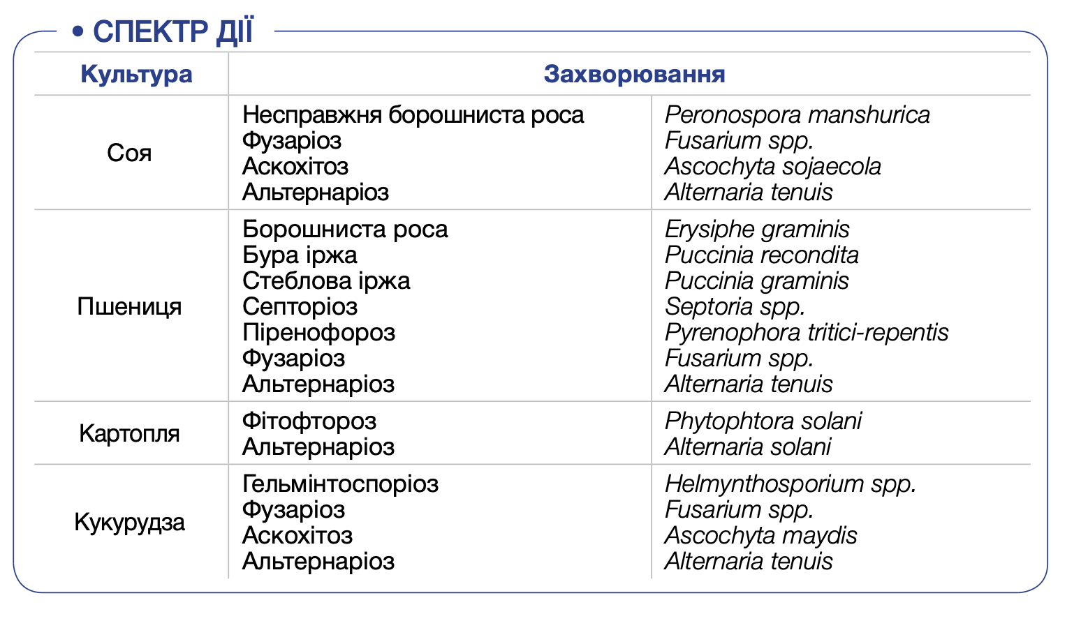 широкий спектр дії, знищує як гіфи, так і спори гриба