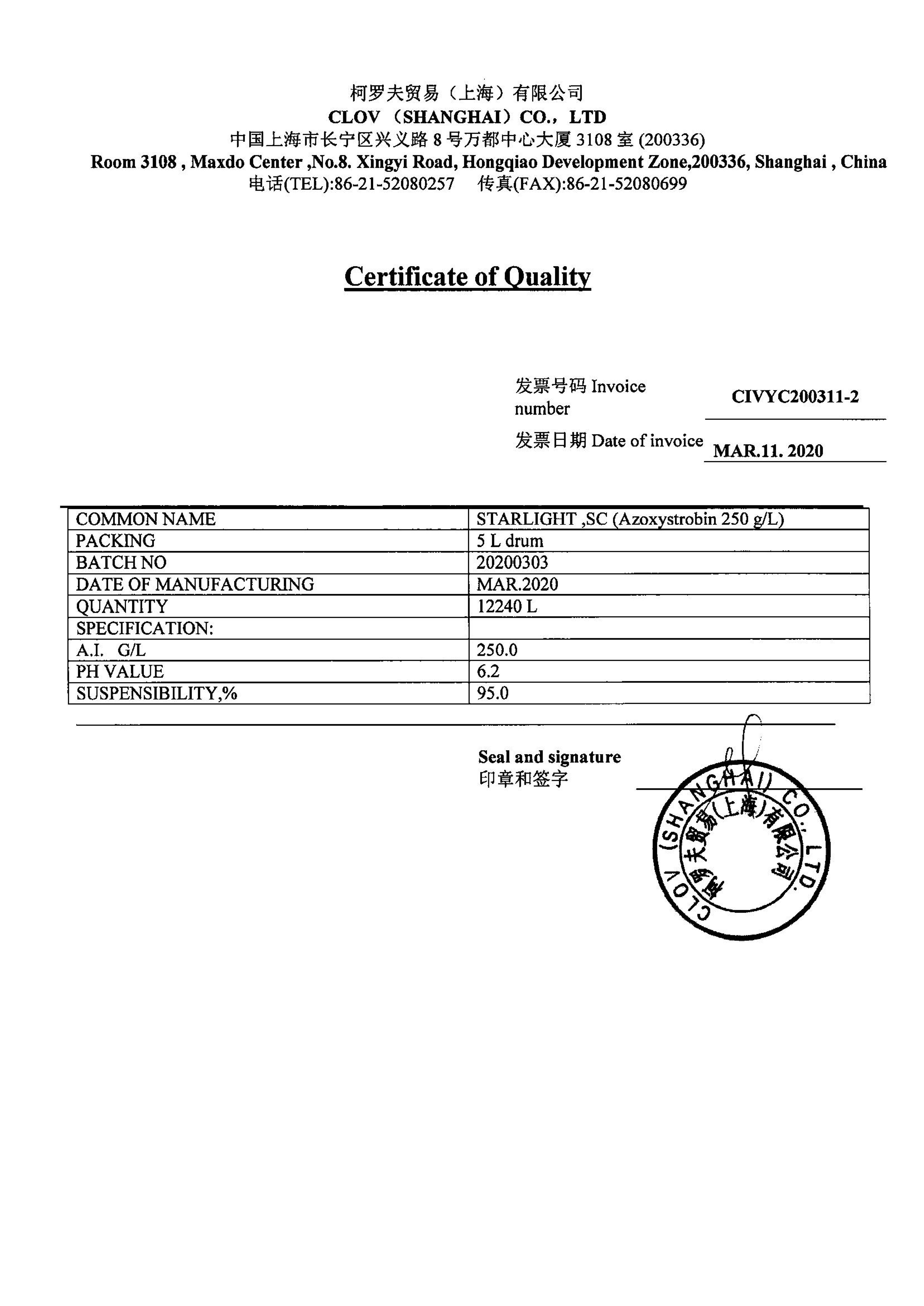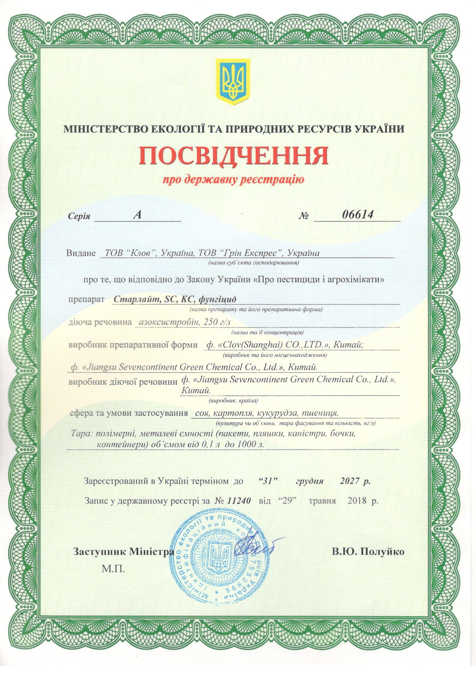 • СТАРЛАЙТ SC, КС – сучасний ефективний фунгіцид системної, профілактичної, лікувальної та викорінювальної дії класу стробілуринів на посівах сої, кукурудзи, пшениці та картоплі.