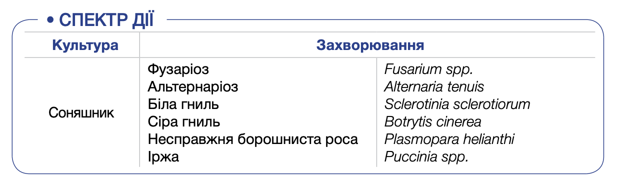• ТРІНІТІ WG, ВГ – високоефективний фунгіцид класу стробілуринів мезостемної і трансламінарної дії з лікувальними та профілактичними властивостями для захисту соняшнику від хвороб.