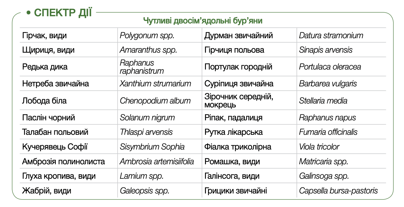 • Кукурудза – ЕКРАН ТОТАЛ ЕС, КЕ; НІКА WG, ВГ; НІКА ПЛЮС WG, ВГ; Д-КАМБА SL, PK;