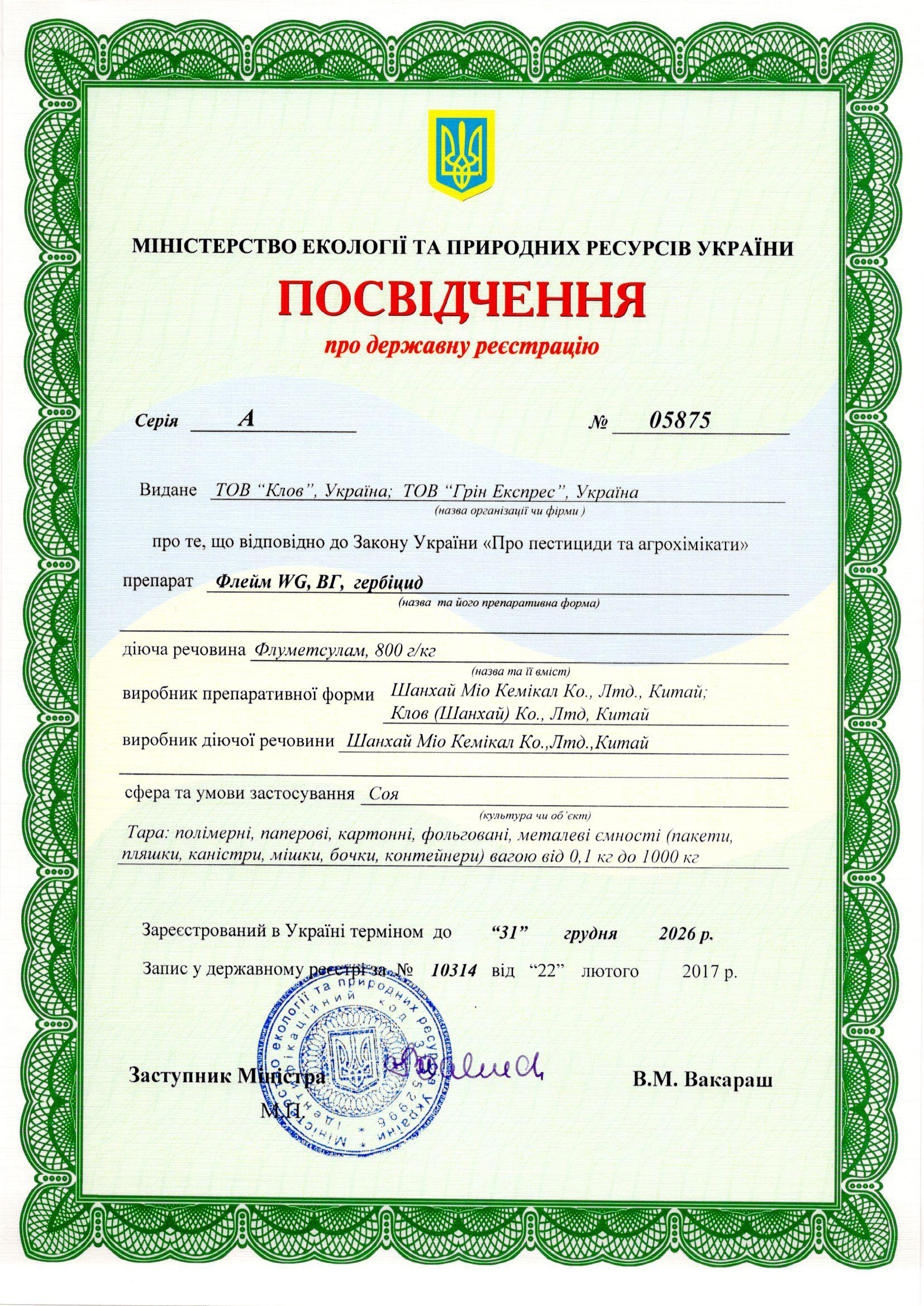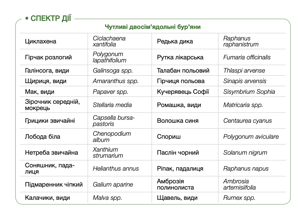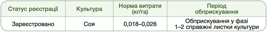 • ФЛЕЙМ WG, ВГ – селективний системний гербіцид проти широкого спектра широколистих бур’янів на сої з вираженою ґрунтовою дією.