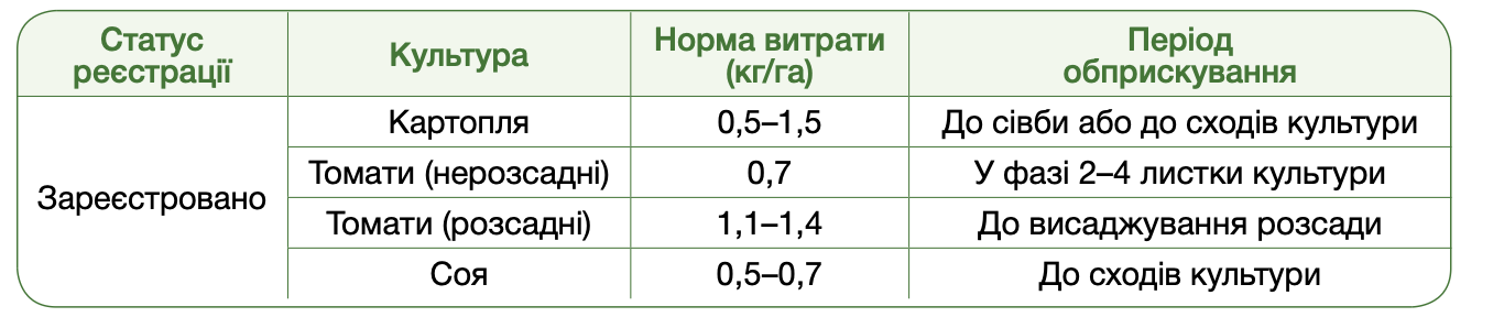 • МЕТРИКС WG, ВГ – системний гербіцид для боротьби проти однорічних широколистих і злакових бур’янів на картоплі, томатах, сої, кукурудзі.