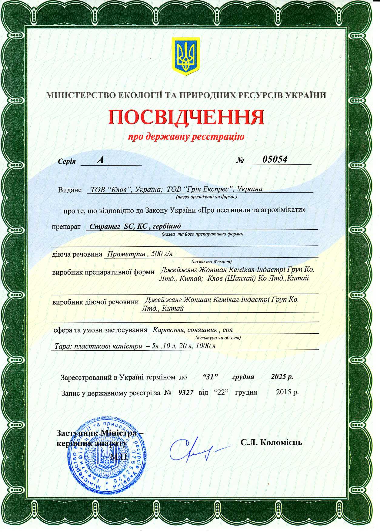 • СТРАТЕГ SC, КС – високоякісний ґрунтовий гербіцид, який використовується в сільському господарстві для захисту посівів картоплі, соняшнику та сої від однорічних дводольних і злакових бур’янів.