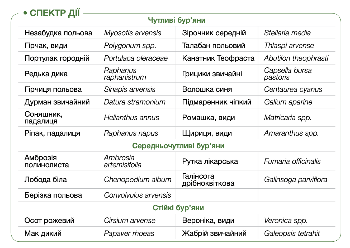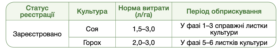 використовується на початкових етапах розвитку сої та гороху, коли бур’яни активно вегетують
