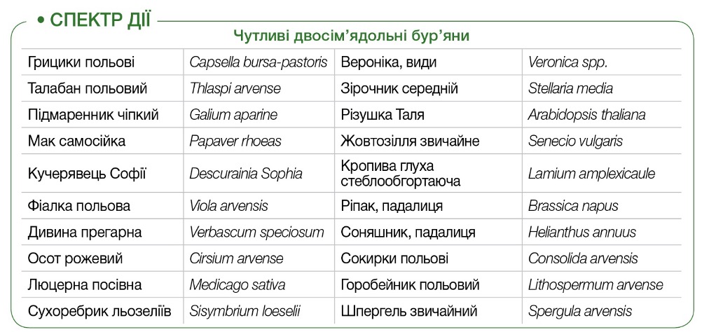 надзвичайно ефективний проти широкого спектра однорічних та багаторічних широколистих бур’янів на посівах озимої пшениці та на газонах за умов післясходової обробки
