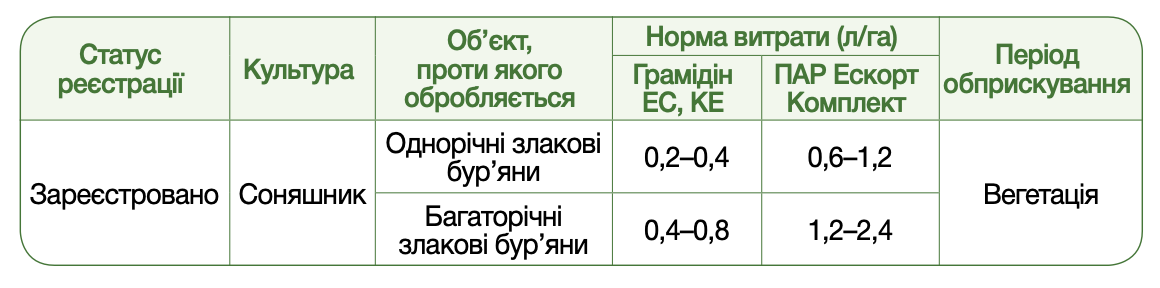 • ГРАМІДІН EC, КЕ – післясходовий селективний гербіцид проти однорічних та багаторічних однодольних бур’янів на посівах соняшнику.