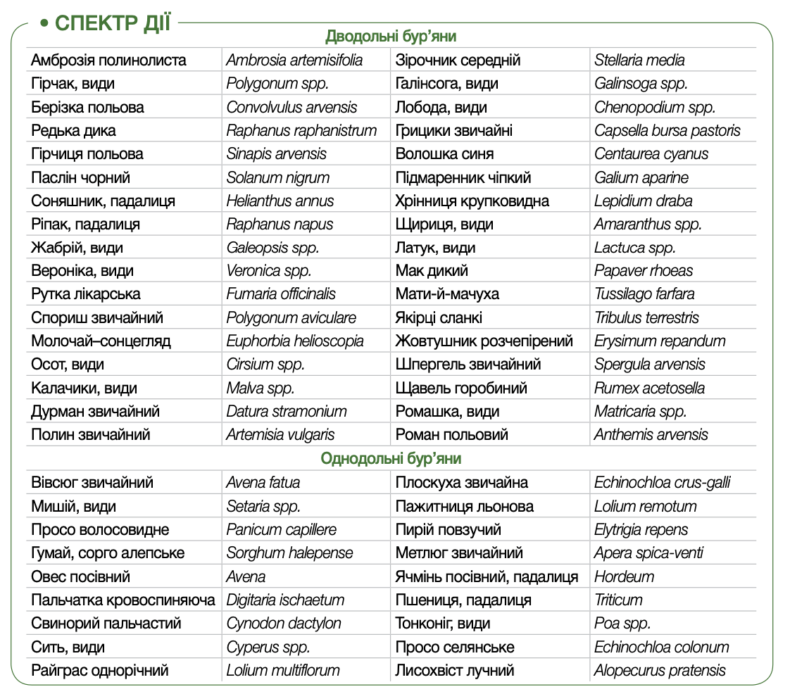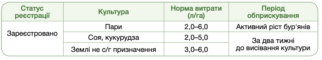 широко використовується навесні за два тижні до посіву більшості с/г культур в мінімальних нормах проти вегетуючих бур’янів