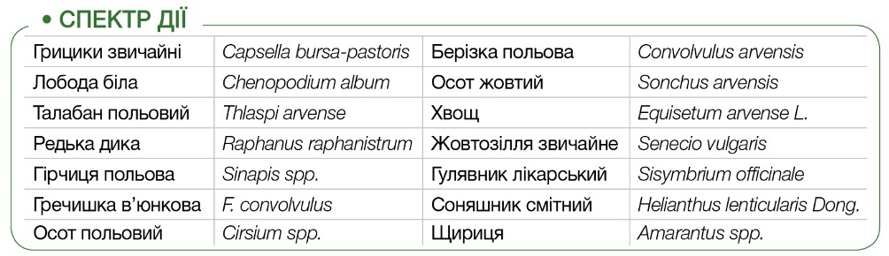 ефективний контроль багаторічних дводольних бур’янів зокрема таких злісних, як берізка польова, види осоту, латук,молочай лозяний та інші
