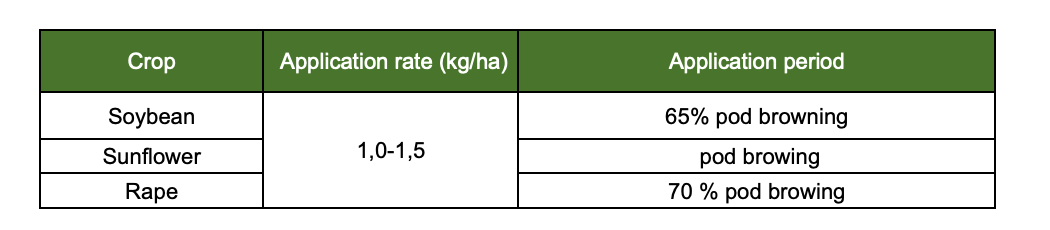 Application is recommended at the stage of physiological seed maturity (seed moisture content 30–50%, depending on the crop). The optimal ambient temperature for desiccation is between +10°C and +20°C. The effectiveness of the product decreases under ultraviolet radiation. For dense crops and high humidity conditions, both the product dose and spray volume should be increased. The presence of dust or dew on plant surfaces reduces desiccation efficacy. Spraying should be carried out in the early morning or late evening, avoiding periods of intense sunlight.