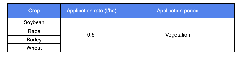 The optimal temperature for spraying is from +15°C to +22°C. It is recommended to apply the product at the early stages of disease development. Spraying should be carried out in dry, windless weather, with wind speed not exceeding 4 m/s. Rainfall occurring 1 hour after treatment does not reduce the effectiveness of the product. For cereal crops, two applications are required:
