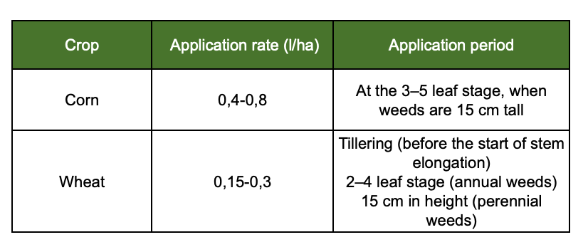 Cereal crops are sprayed from the beginning of tillering (3–5 leaf stage) to stem elongation. The optimal weed development stage at the time of application. Annual broadleaf weeds — 2 to 6 leaves, рerennial weeds — up to 15 cm in height Cool weather slows down the visible effect of the product. To broaden the spectrum of weed control in wheat, the product should be applied in combination with the herbicide GRAND WG. In corn, it can be used in combination with NIKA WG, NIKA PLUS WG, or PANTEON WG.