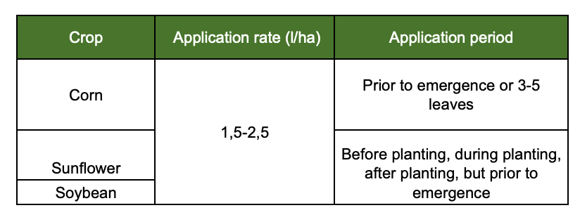 The application rate is adjusted depending on the mechanical composition of the soil and humus. On heavy loamy soils and soils with a high content of humus, the consumption rates are maximum, respectively, light loamy and low-humus soils require lower rates. After spraying, it is necessary to exclude inter-row processing, as this will lead to the destruction of the herbicide screen. Can be used in tank mixes: