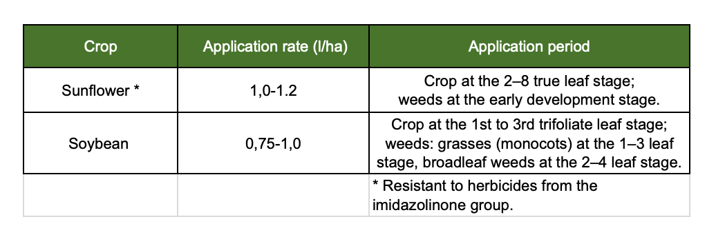 The highest effectiveness of IROKEZ SL, SC is observed when applied in the morning, under temperatures ranging from +15°C to +25°C. The weather should be calm and without precipitation. In case of Chenopodium species (lambsquarters) presence in soybean fields, it is recommended to use a tank mix with the herbicide BENTAGRAN SL, SC at a rate of 1.5–2.0 L/ha. Do not mix with grass herbicides or sulfonylurea-based products. Do not apply more than once per season. After treatment, avoid the use of sulfonylurea and imidazolinone herbicides on the same field during the same season.