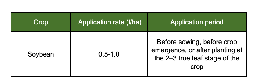 The optimal temperature for application is between +15°C and +25°C. Spraying is best carried out in the morning or evening. The ideal application period is during the intensive weed growth stage (grasses at 2–3 leaf stage, broadleaf weeds no more than 2–4 leaves). When applying PIKET SL, as a pre-emergence treatment, it must be incorporated into the soil, and the presence of plant residues should be minimized. During the growing season after application, the use of sulfonylurea herbicides (such as thifensulfuron-methyl, chlorsulfuron, etc.) is prohibited. Effective results have been noted when mixed with BENTAGRAN SL and SOYGUARD WG.Similar products are used to protect peas and alfalfa.