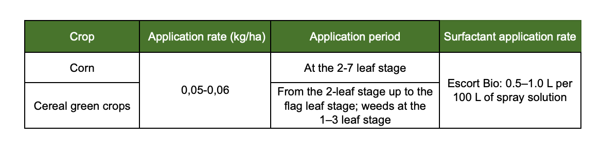 RAPIDUS WG, WG should be applied at temperatures between +5°C and +25°C under dry and windless conditions, preferably in the morning or evening when solar radiation is minimal and no rainfall is expected within the next 8 hours. The use of an adjuvant is essential to achieve the desired efficacy. Application is not recommended on physically damaged crops (e.g., due to hail, wind, or insect infestation) or in cases of legume undersowing. The product can be used alone or in tank mixtures with the following herbicides:
