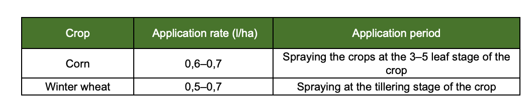 It can be used in regions with low precipitation levels. The application should be carried out during the active growth phase of weeds: at the 2–10 leaf stage for annual weeds and 15–20 cm in height (rosette stage) for perennial weeds*. To enhance herbicidal activity, the product may be used in tank mixtures with other herbicides commonly applied in cereal crops.