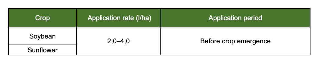 Application of TERRAMIN EC, is best carried out in calm weather, preferably in the morning. This ensures the effective action of the product. When applied correctly, pendimethalin distributes evenly within the seed layer of the soil within two days, forming a barrier against weed growth. The herbicide becomes active at the moment weed seeds begin to germinate. The soil must be well-prepared. The application rate of the product depends on the soil’s mechanical composition and humus content. The highest application rate is recommended for soils with high organic matter, hot weather conditions, and a likelihood of rainfall. To determine the optimal dosage, the weed species present must also be considered, as they have varying sensitivity to the herbicide. The working solution should be used immediately after preparation. The re-entry interval for manual labor is 7 days, and for mechanized operations — 3 days. The pre-harvest interval (days before crop harvest) is 25 days.