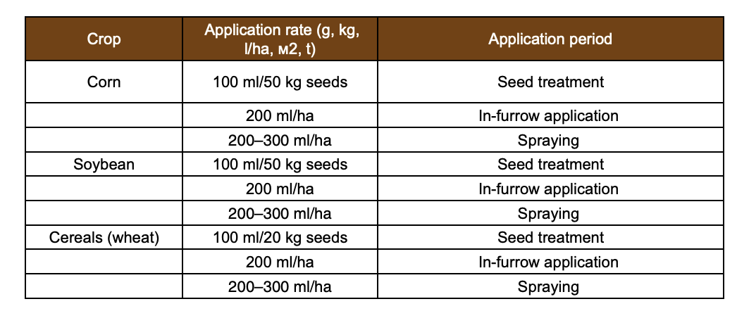 the optimal concentration and viability of nitrogen-fixing and growth-promoting bacteria (Azospirillum brasilense) ensure an additional nitrogen supply for corn, soybean, and wheat crops, as well as improved plant development.