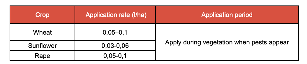 Maximum effectiveness is achieved when the product is applied in a timely manner, based on forecasts and the first signs of pest appearance. It is compatible with most pesticides, except those with an alkaline reaction. To ensure complete control of hidden-living pests, the application rate should be increased to 0.1–0.15 L/ha, depending on weather conditions and pest species. The insecticide should be applied to actively growing plants, not those under stress. Application during plant stress reduces product efficacy. The optimal air temperature for use is +10°C to +25°C. To enhance efficacy, it is recommended to use in combination with KARATEL EC or KARATEL PLUS EC.