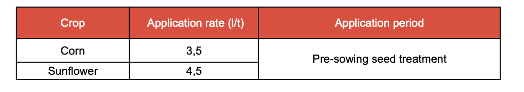 The seed material must be cleaned of dust and impurities, have standard moisture content, and the batch should not contain broken seeds. There is no need to add additional stickers or adhesives, as they are already included in the formulation. Seed treatment should be carried out using specialized equipment. The quality of application is monitored by the intensity of seed coloration. The product can be used in combination with KOMANCH WG, WG.